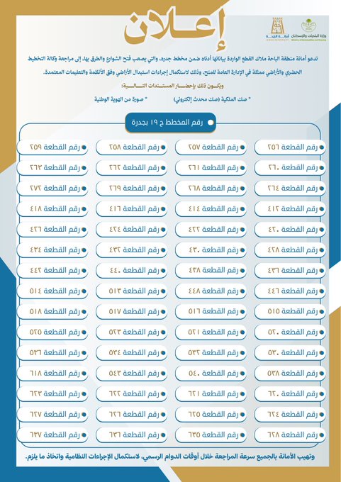 تدعو أمانة منطقة الباحة ملاك القطع الواردة بياناتها أدناه ضمن مخطط جدره، والتي يصعب فتح الشوارع والطرق بها، إلى مراجعة #وكالة_التخطيط_الحضري_والأراضي ممثلة في #الإدارة_العامة_للمنح، وذلك لاستكمال إجراءات استبدال الأراضي وفق الأنظمة والتعليمات المعتمدة.