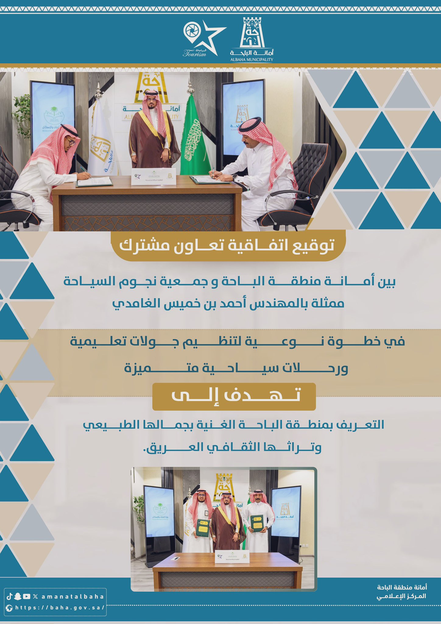 وقعت #أمانة_منطقة_الباحة اتفاقية تعاون مشترك مع جمعية نجوم السياحة، التي يمثّلها المهندس أحمد بن خميس الغامدي، في خطوة نوعية لتنظيم جولات تعليمية ورحلات سياحية متميزة تهدف إلى التعريف بمنطقة الباحة الغنية بجمالها الطبيعي وتراثها الثقافي العريق. #وزارة_البلديات_والإسكان #الباحة_تراث_وسياحة